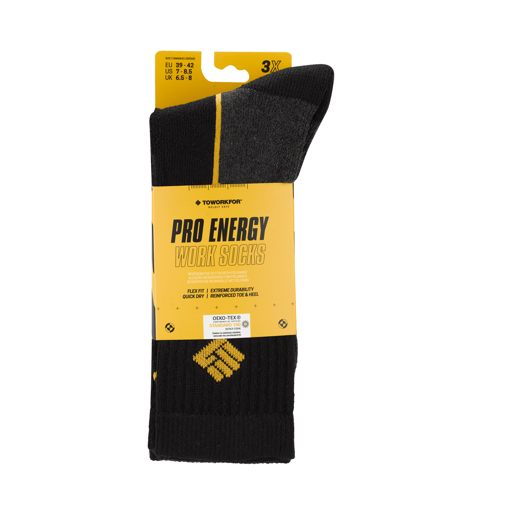 Der Ganzkörper-Stretchrahmen der PRO ENERGY Arbeitssocken sorgt für den perfekten Sitz und die nötige Dehnbarkeit während des gesamten Arbeitstages, ob drinnen oder draußen. Hergestellt aus regenerierter Baumwolle und Polyamid, mit Verstärkungen im Fersen- und Zehenbereich, um maximalen Komfort, Atmungsaktivität und Haltbarkeit zu bieten.